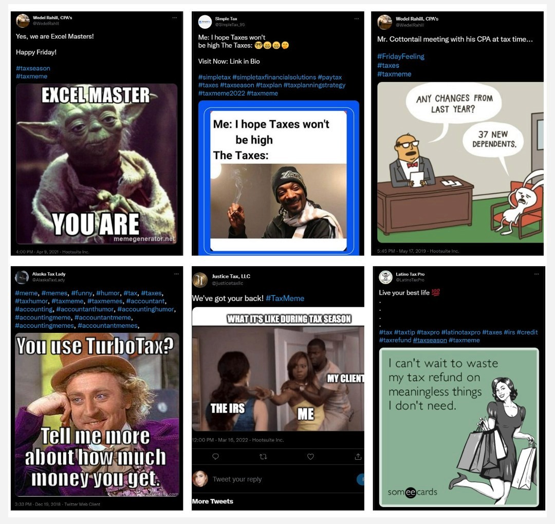 Ecommerce brands do well with suggestions to splurge on their products with tax refunds or suggestions to treat yo’self because taxes are… well, taxing. If you don’t sell goods or services, relatable tax season memes should do the trick.