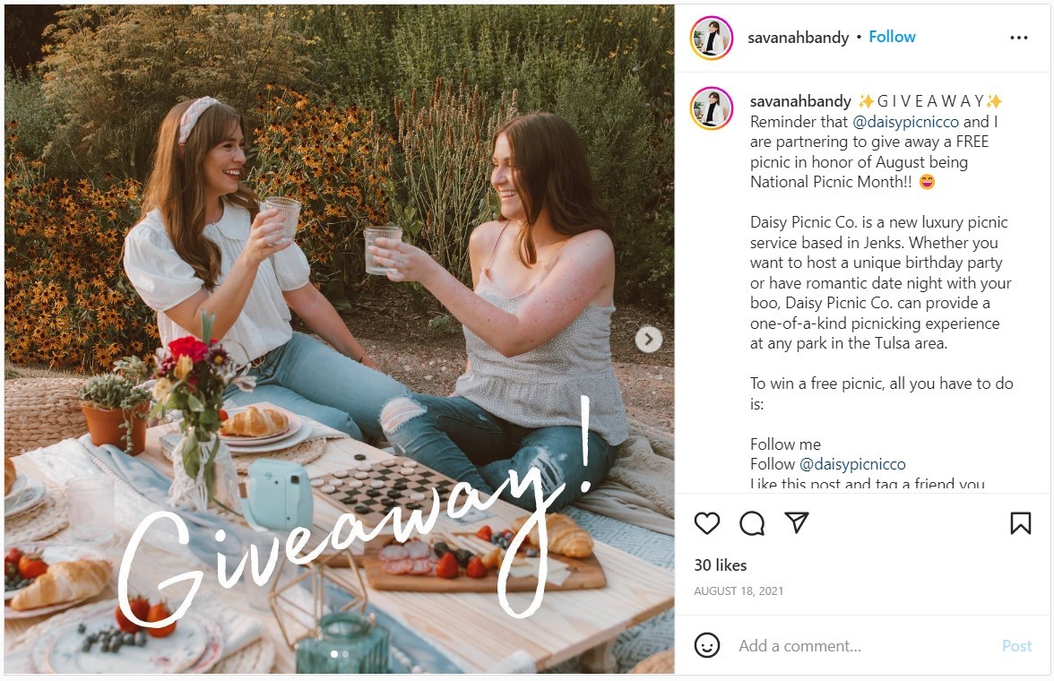 Influencers can share recipes for picnic dishes like potato salad or create a fun carousel post showing step-by-step how to put together the perfect picnic basket with your favorite cheeses, charcuterie, or vegetarian snacks.
