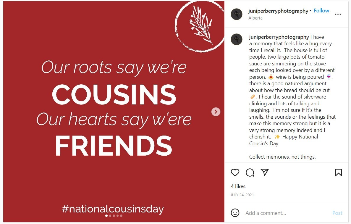 Piggybacking off of Cousins Day, create posts people will save or share such as quotes to appreciate the presence of aunts and uncles in our lives. Include a CTA to tag a favorite aunt or uncle. Ecommerce brands can offer a discount code to encourage gift giving. Here is a quote/caption idea: