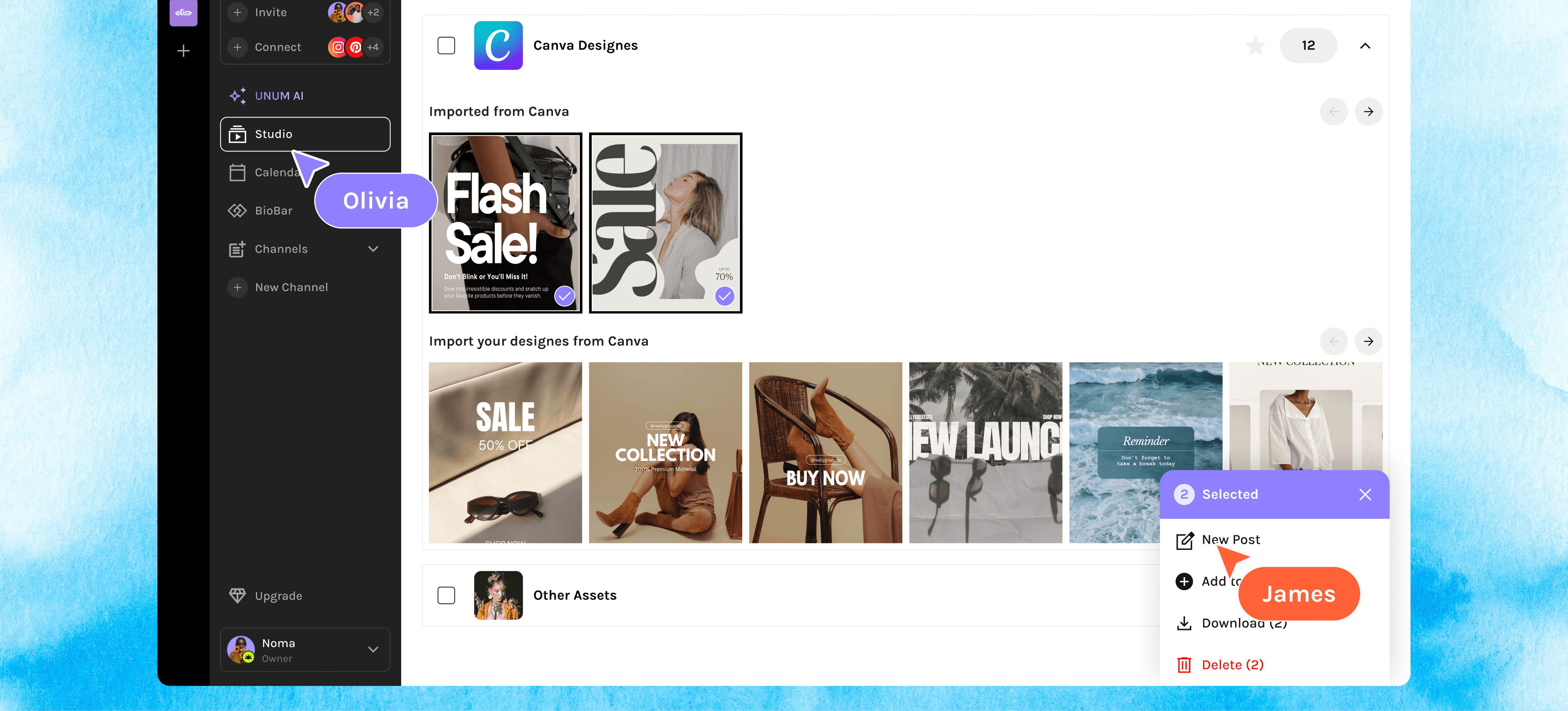Use UNUM’s Studio to sort your Canva assets into channels, campaigns, or clients — no more design chaos. Just beautiful content at your fingertips.