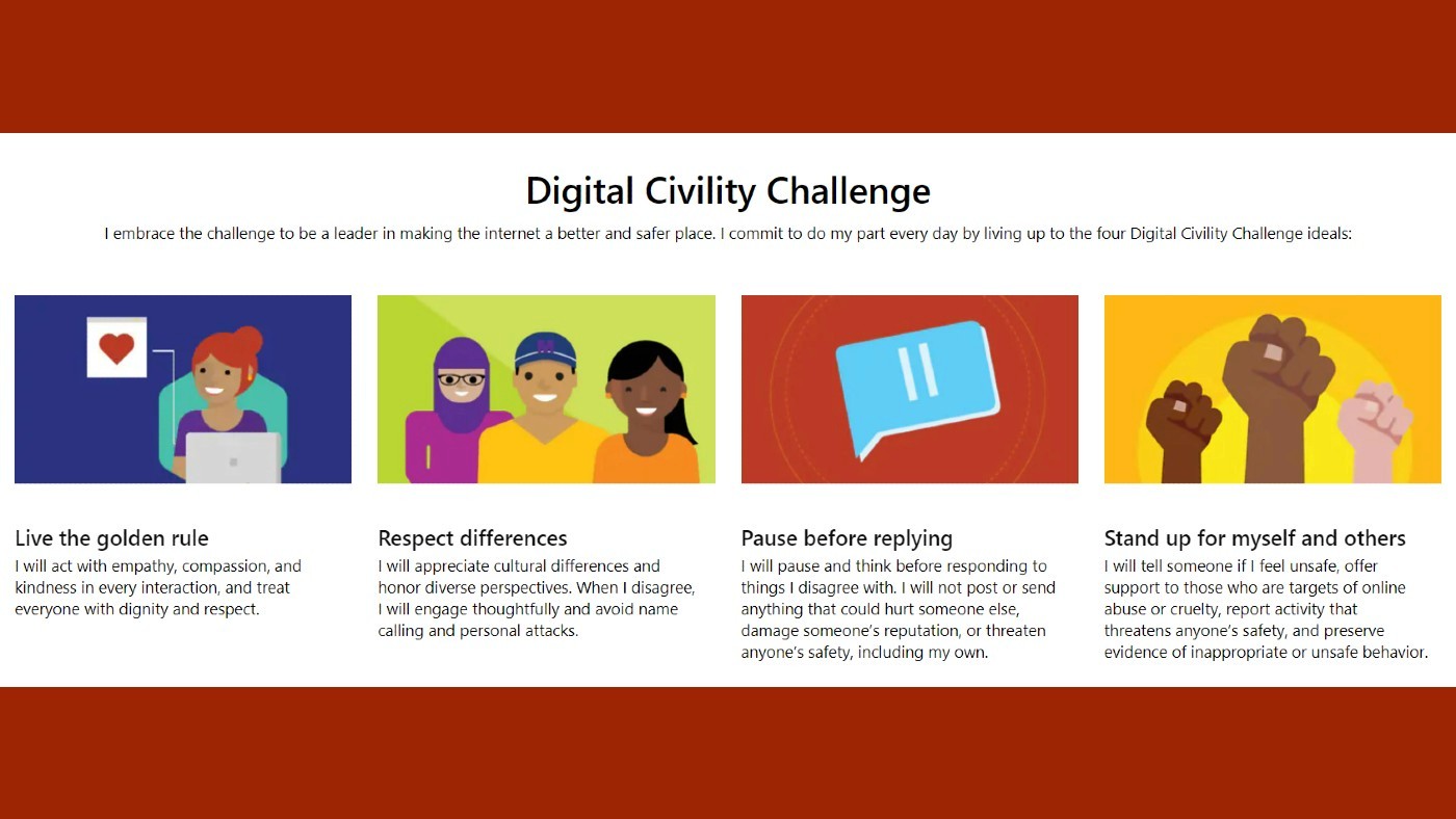 Social media CEOs, NPOs, influencers, and celebrities expressed their support, and some took action to make the vision a reality. Many platforms pledged updates to features and controls, issued reminders on protecting identity and safety, and offered prompts for mental health checks. Microsoft challenged users to live up to the four tenets of digital civility: Live the golden rule, respect differences, pause before replying, stand up for myself and others.