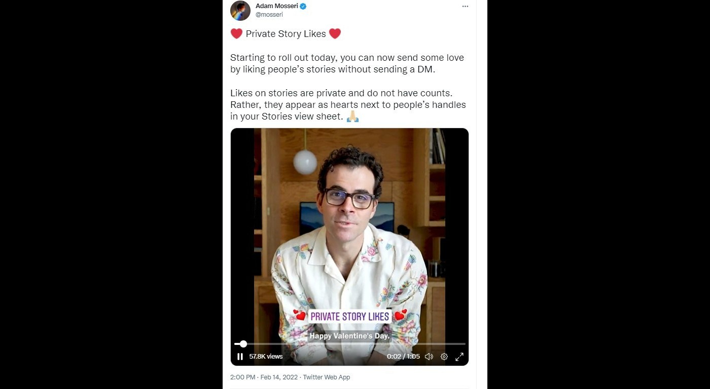 No longer will a Like on a Story translate to a DM. On February 15th, the CEO of Instagram, Adam Mosseri, announced a new feature called Private Story Likes, allowing viewers to react to an Instagram Story (just like a conventional IG Grid Post) with a heart emoji. Creators will be able to see both their views and likes, privately, in the Story’s view sheet indicated by a heart next to the viewer's name.